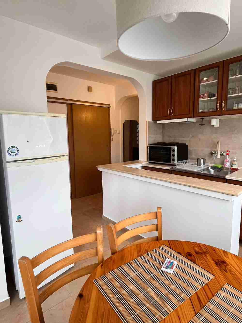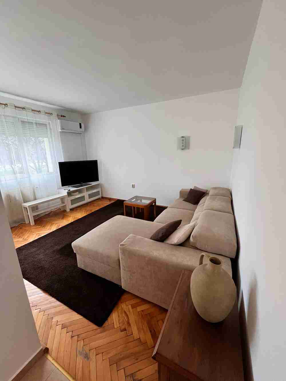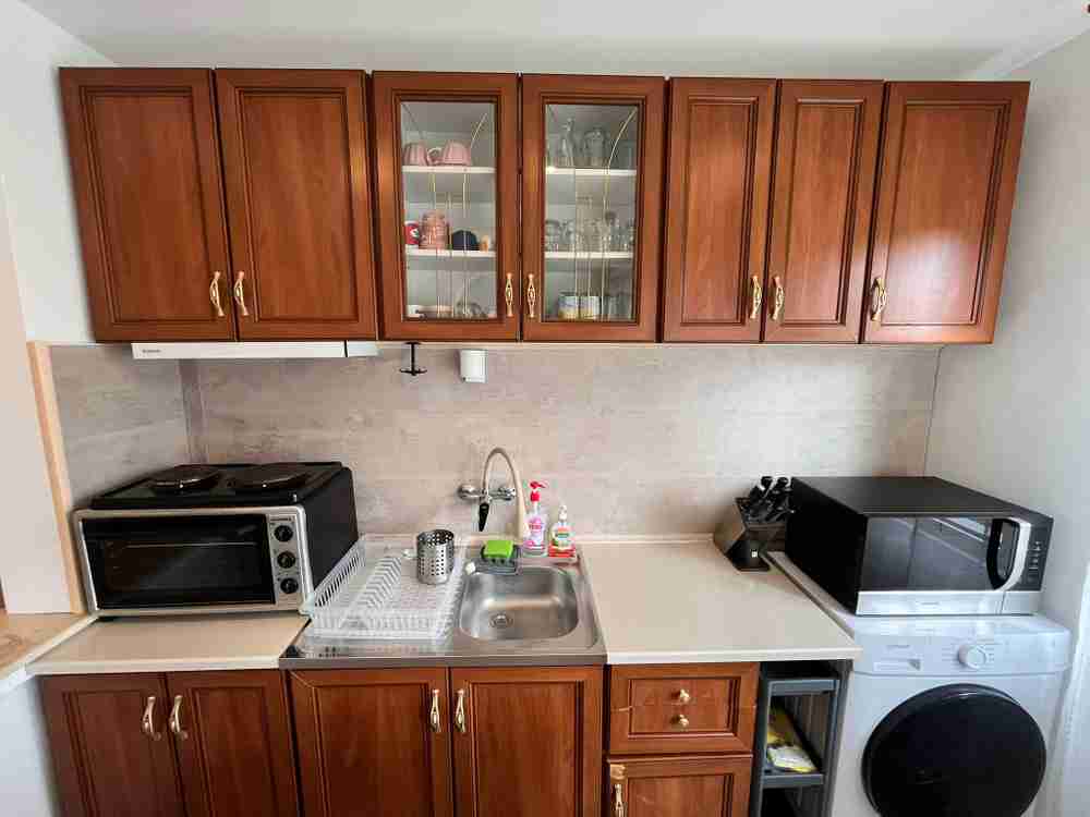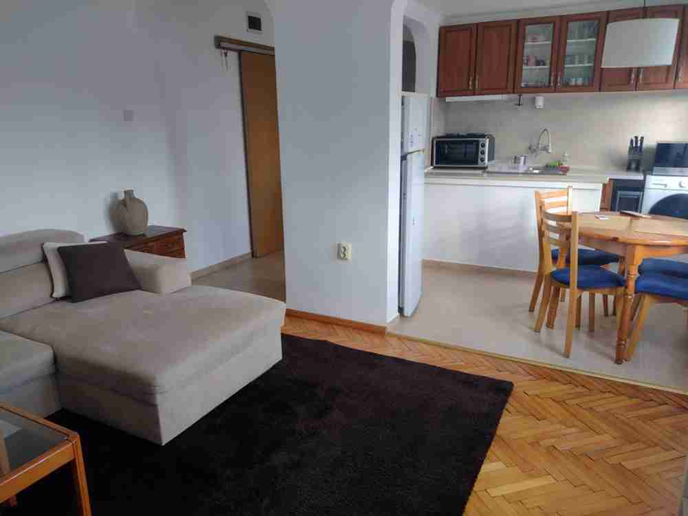 Обзавеждането включва - напълно оборудвана кухня, диван с функция сън, холни масички, трапезарна маса с четири стола, хладилник с фризер, пералня със сушилня, печка, микровълнова фурна, телевизор, спалня, скрин, гардероби, работна маса, външни ролетни щори. Настилките са от естествен паркет, а в банята - фаянс и теракот. Топло, светло и компактно жилище в тухлена сграда с ниски енергийни разходи.