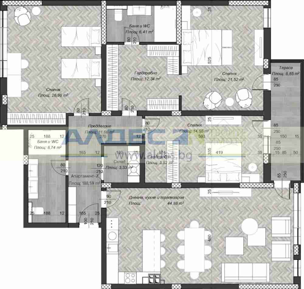 НОВ, ЛУКСОЗЕН, ТУХЛЕН МНОГОСТАЕН апартамент в центъра на София, в близост до важни локации, като: административни сгради, учебни заведения, множество магазини, детски градини. Апартаментът ще бъде разположен на етаж трети от тринадесет етажна сграда. Застроена площ: 188.59 кв.м. Обща площ: 222.37 кв.м. РАЗПРЕДЕЛЕНИЕ: предверие: 11.88 кв.м., склад:3.33 кв.м, гардеробно: 12.34 кв.м., 3 спални, съответно: 26.96 кв.м., 21.52 кв.м., 14.5 кв.м., дневна, кухня, трапезария: 44.89 кв.м., тераса: 8.85 кв.м. ИЗЛОЖЕНИЕ: ЮИ/С. ЗА ПОВЕЧЕ ПОДРОБНОСТИ И ОГЛЕДИ: 0892242802, оферта: 11867 а2 | |
