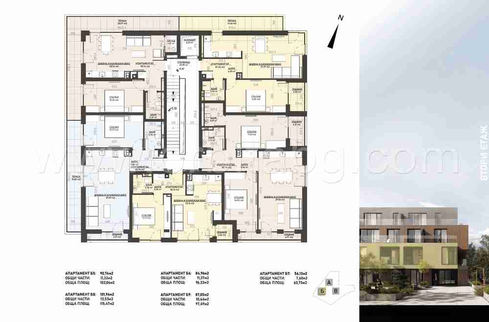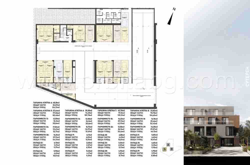 Сграда Б е с 1724 кв.м. надземно РЗП и 1070 кв.м. подземно РЗП и дава възможност на избор от: 2 бр. едностайни апартамента, 8 бр. двустайни, 4 бр. тристайни.