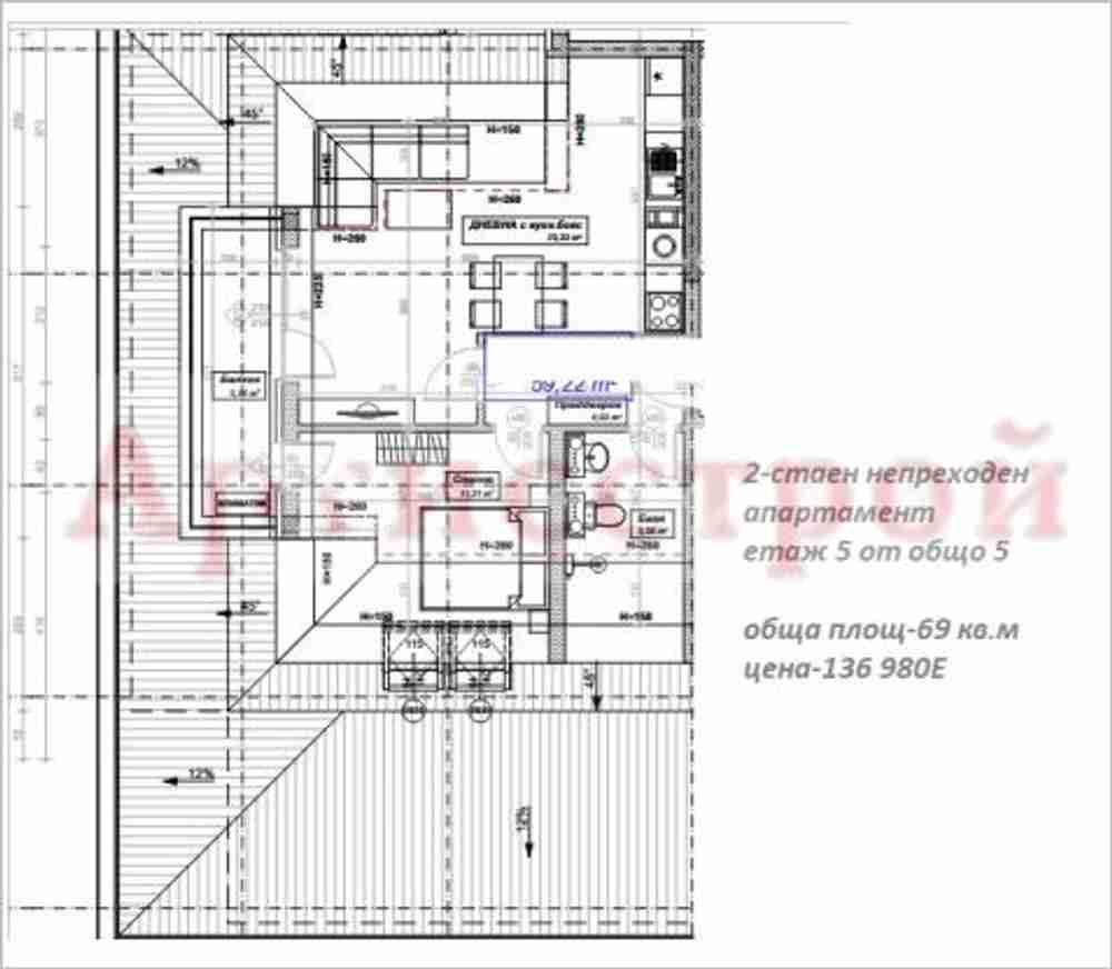 Разпределение: антре, дневна, кухненски бокс, спалня, баня с тоалетна, тераса.