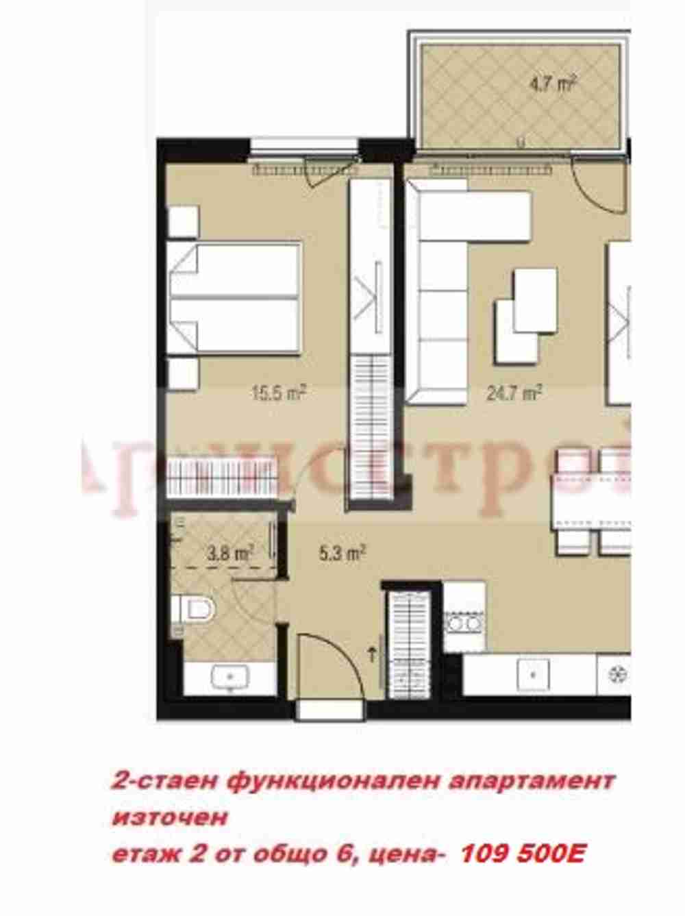 Агенция „Артисстрой“ /www.artisstroy.com/ предлага: двустаен източен функционален апартамент с ЗП 61 кв.м на етаж 2 от общо 6 в нова сграда с общи луксозни части ,контролиран достъп ,паркоместа и гаражи с Акт 16 до края 2024г. На тихо място в кв.Малинова Долина, район Студентский.