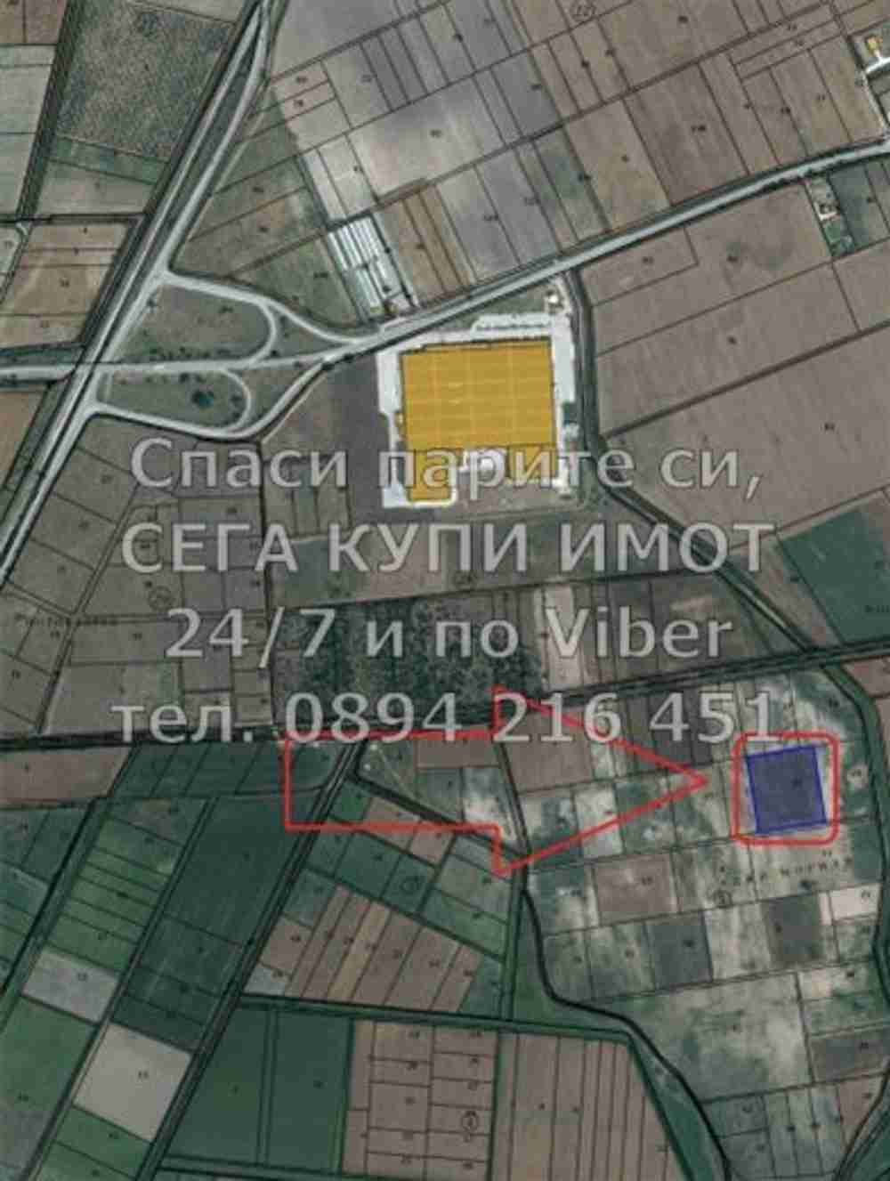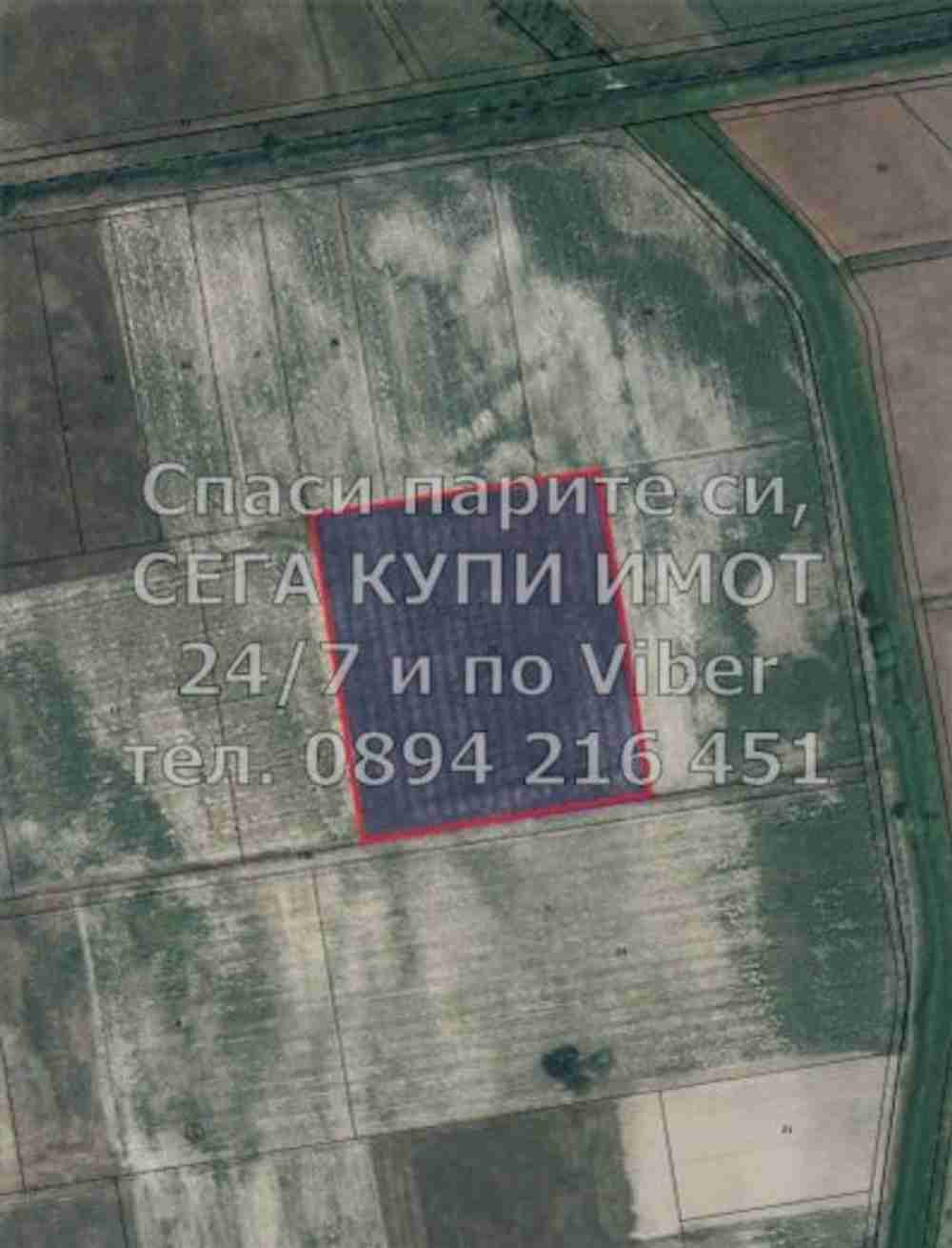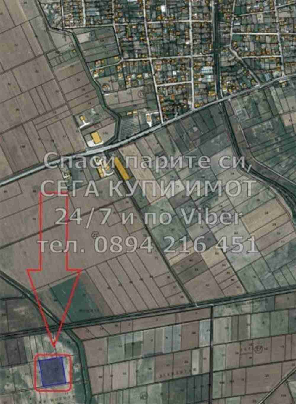 Описание: код 61557. Овощна градина 11250м2 със сливи и череши, преди селото вдясно. Парцелът е правоъгълна форма и граничи с черен път.
