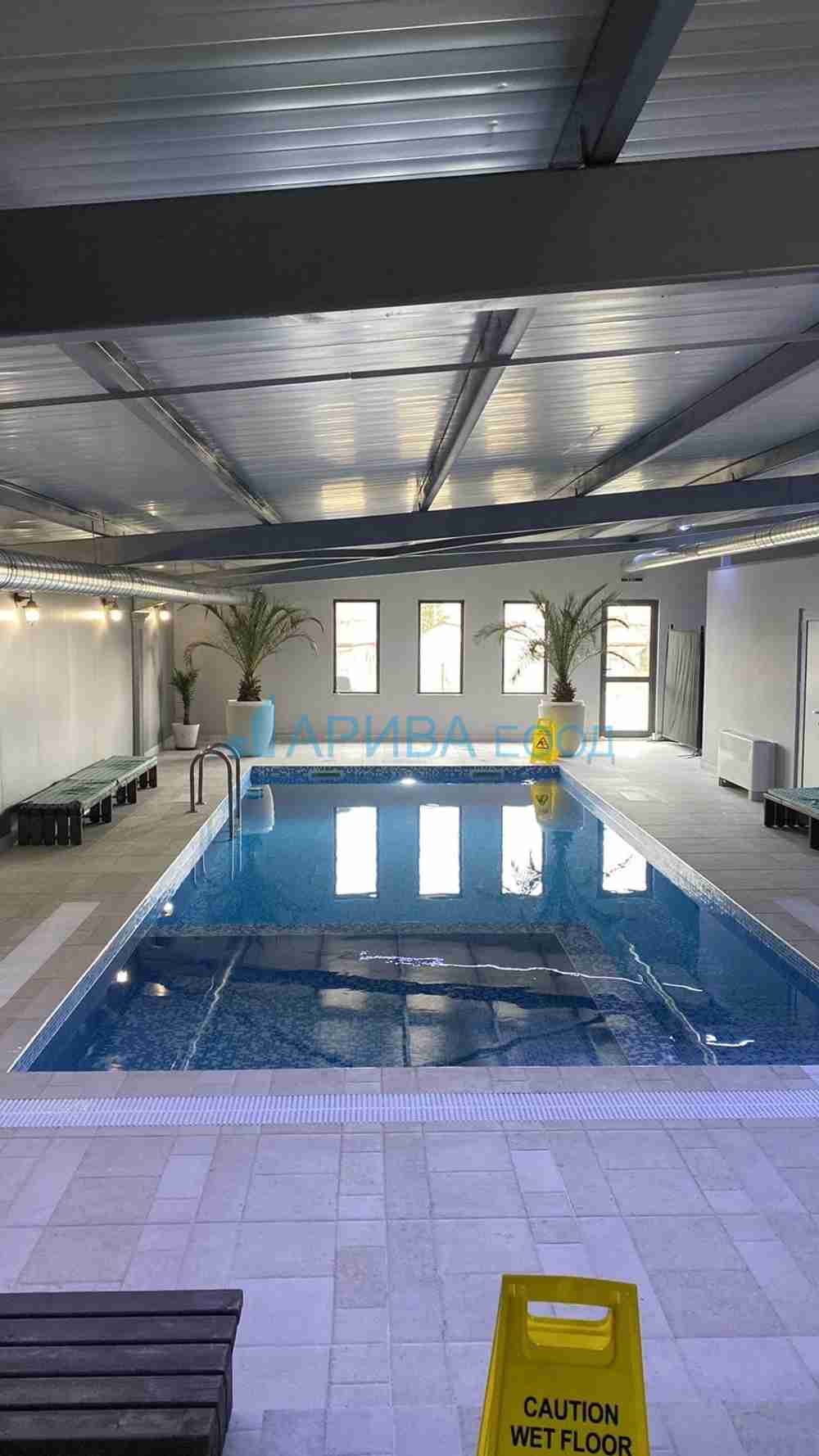 Описание на закрит басейн: 200 кв. Помещение, топъл закрит плувен басейн, офис-рецепция; топла връзка, 2 бани и тоалетни, 2 съблекални, инфраред сауна.