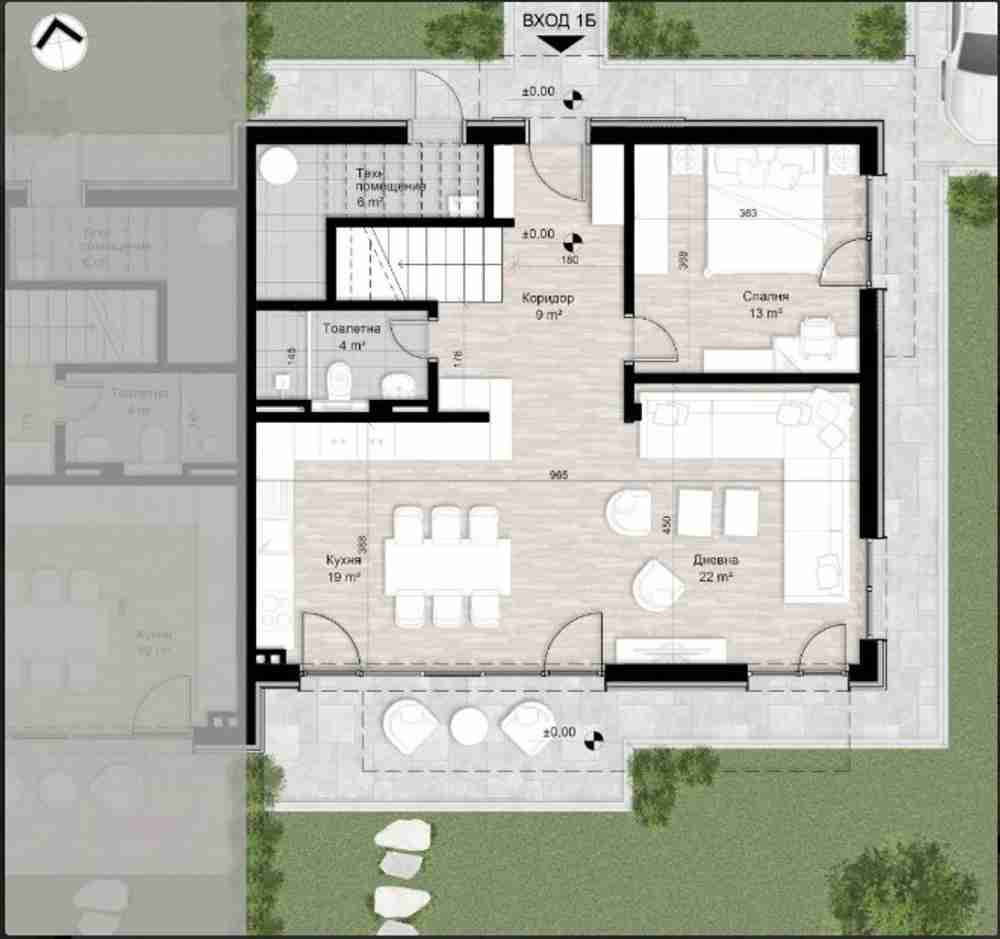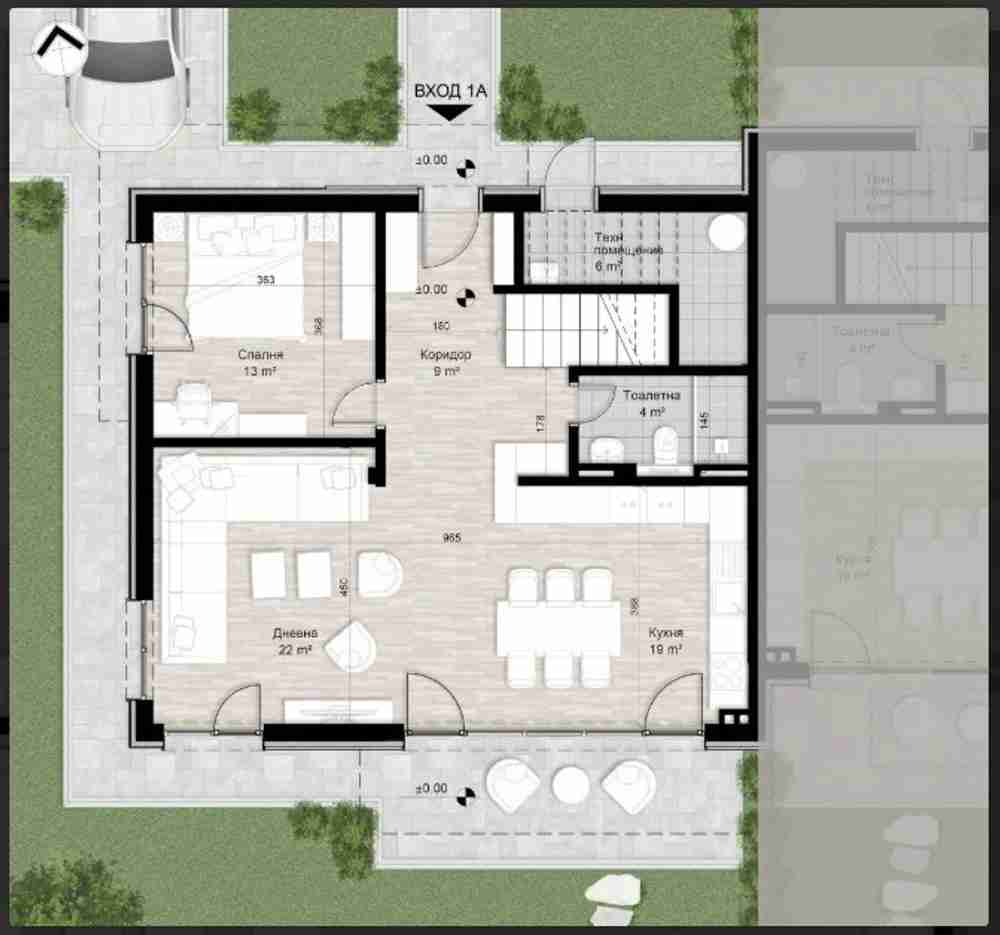 На първия етаж ще откриете удобно входно антре, водещо към просторна дневна зона с кухненски кът и трапезария с чиста площ от 41 кв.м., с директен излаз към голям южен двор. На същото ниво са разположени още спалня за гости или кабинет, удобна тоалетна, стълбище към горното ниво и външен склад/техническо помещение, осигуряващо допълнително пространство за съхранение.