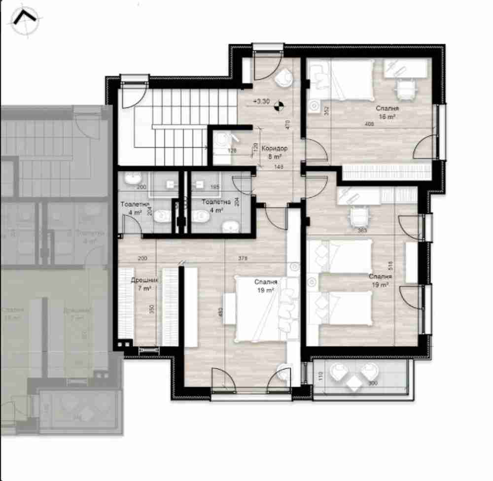 На втория етаж са разположени три просторни спални, включително родителска спалня с отделен дрешник и собствена баня с тоалетна. Другите две спални разполагат с достъп до обща баня с тоалетна. За допълнително удобство, на етажа има и практично мокро помещение. Южната тераса е идеално място за сутрешно кафе или вечерен релакс, предоставяйки красива гледка и много слънчева светлина.