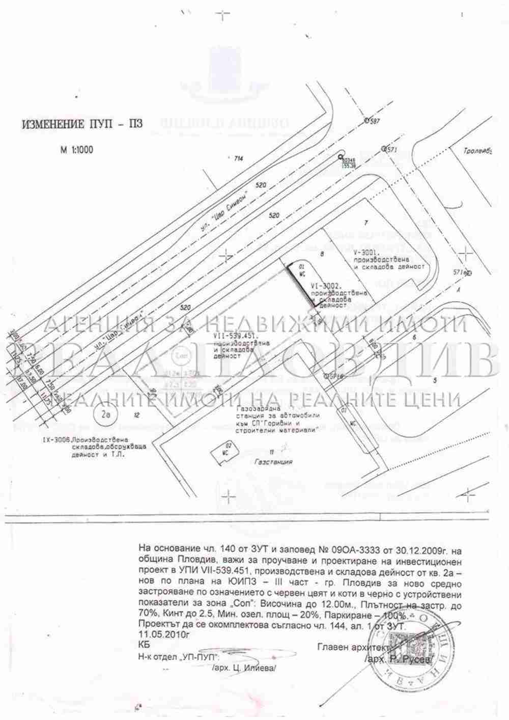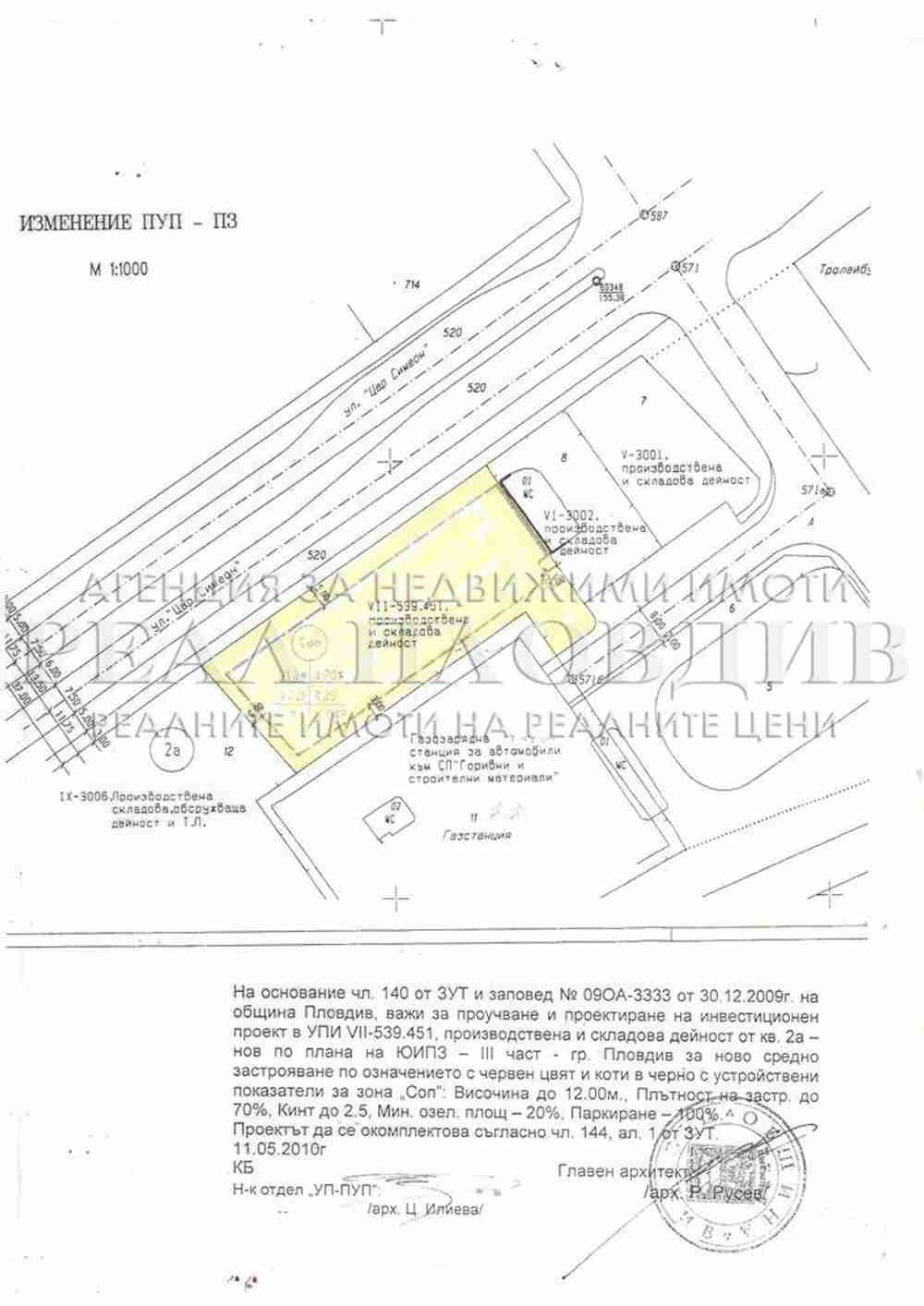 Оф. № 4943, УПИ 2759 кв. м. с лице 80 м. на оживен булевард "Цар Симеон", по ПУП на Югоизточна промишлена зона - трета част на гр. Пловдив, район Тракия, ЮИПЗ за ново средно застрояване, Кота корниз до 12 м., Плътност 70%, Кинт до 2.5, Мин. озеленени площи 20%, Паркиране 100%. Теренът е подходящ за промишлено и административно строителство, складови и търговски цели, офис сгради и др.
