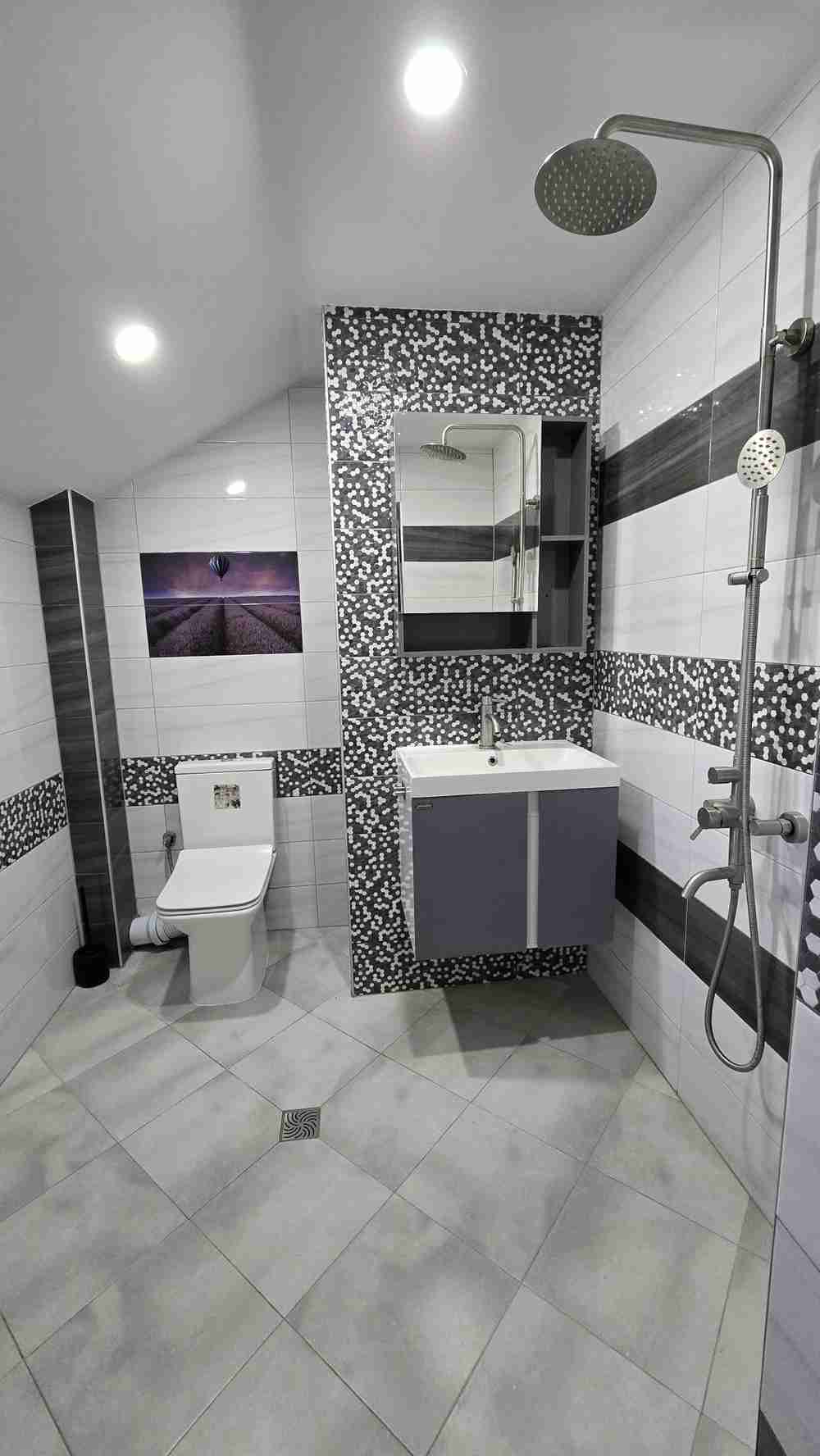 ✅Първото ниво се състои от входно антре, кухня с трапезария и хол, спалня с гардеробна, баня с тоалетна и панорамна тераса.
