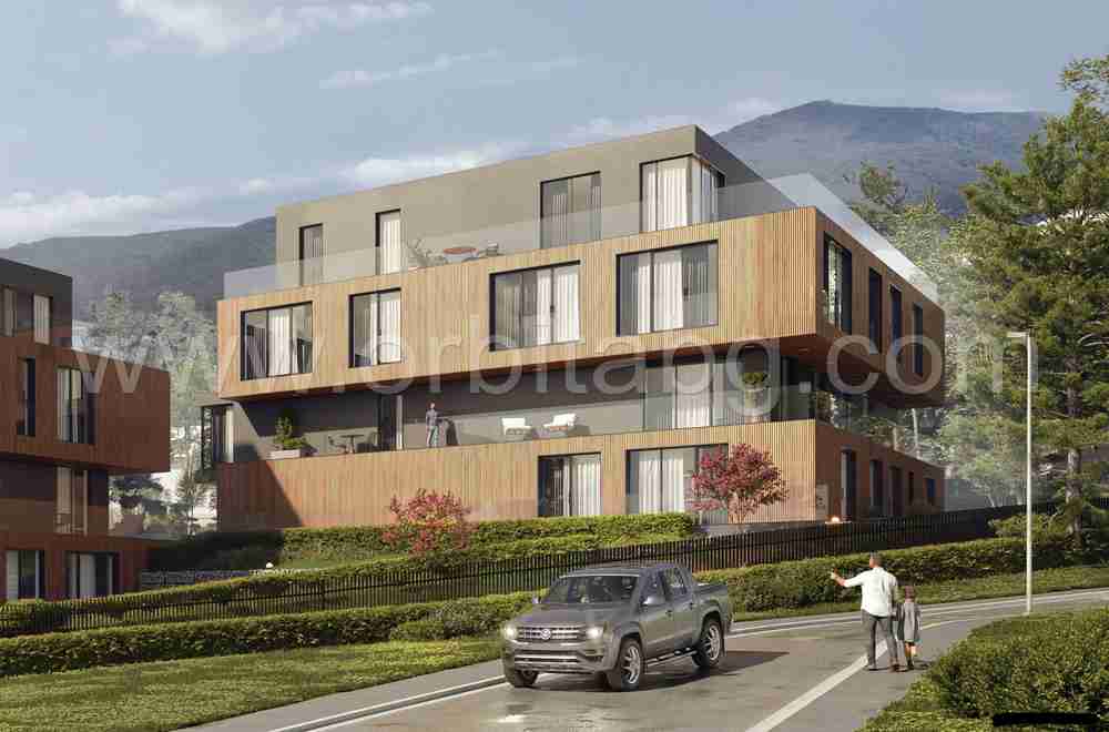 АРХИТЕКТУРА: Трите сгради са ситуирани спрямо теренните особености на парцела, така че се оформя и вертикално шахматно поведение от порядъка на един етаж. Това дава максимална независимост между отделните жилищни единици, което от своя страна директно рефлектира върху качеството на живот. В допълнение, всеки етаж е разместен хоризонтално спрямо този под себе си, което осигурява пластика, динамика и естетика от функцията на оформилите се пространства. Трите сгради разполагат с общ сутерен, разположен на 2 подземни нива посредством закрита рампа, като от сградите има директен достъп до апартаментите чрез стълбище и асансьор.
