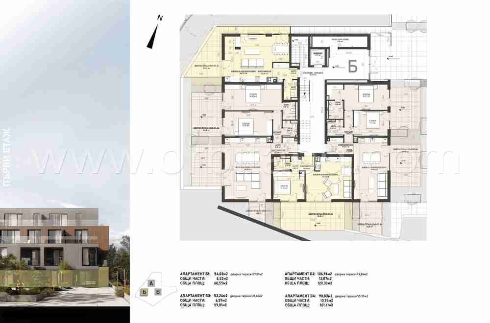 Сграда Б е с 1724 кв.м. надземно РЗП и 1070 кв.м. подземно РЗП и дава възможност на избор от: 2 бр. едностайни апартамента, 8 бр. двустайни и 6 бр. тристайни апартамента.