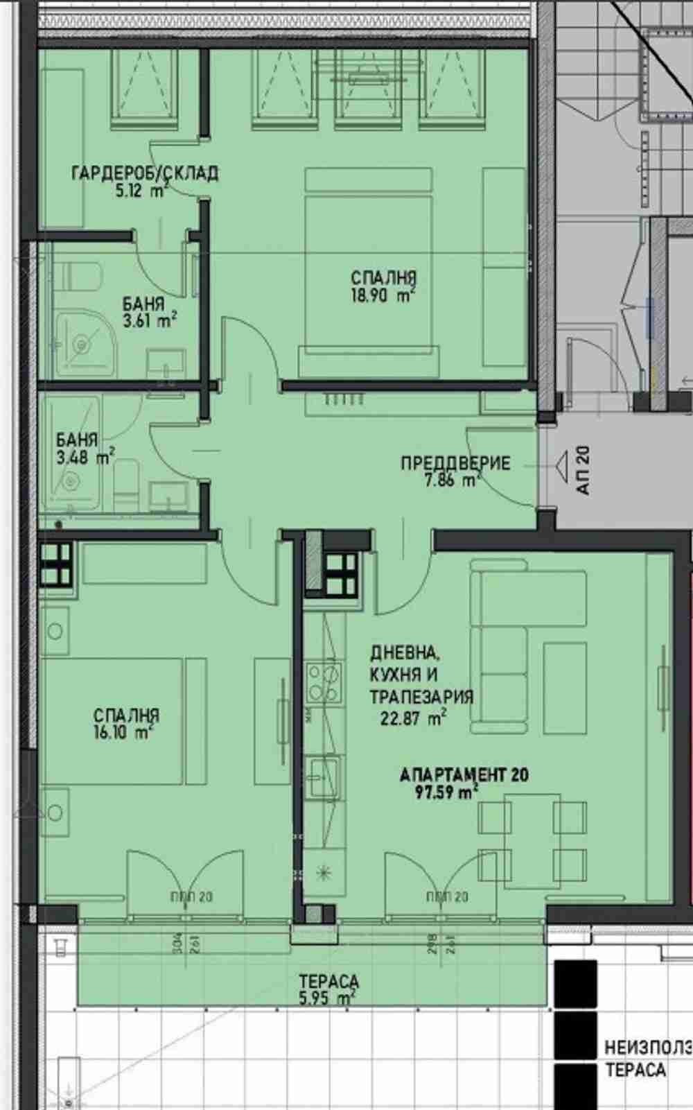 Предлагаме Ви тристаен апартамент в сградата. Обща площ 120.61кв.м. чиста площ 101.25кв.м.