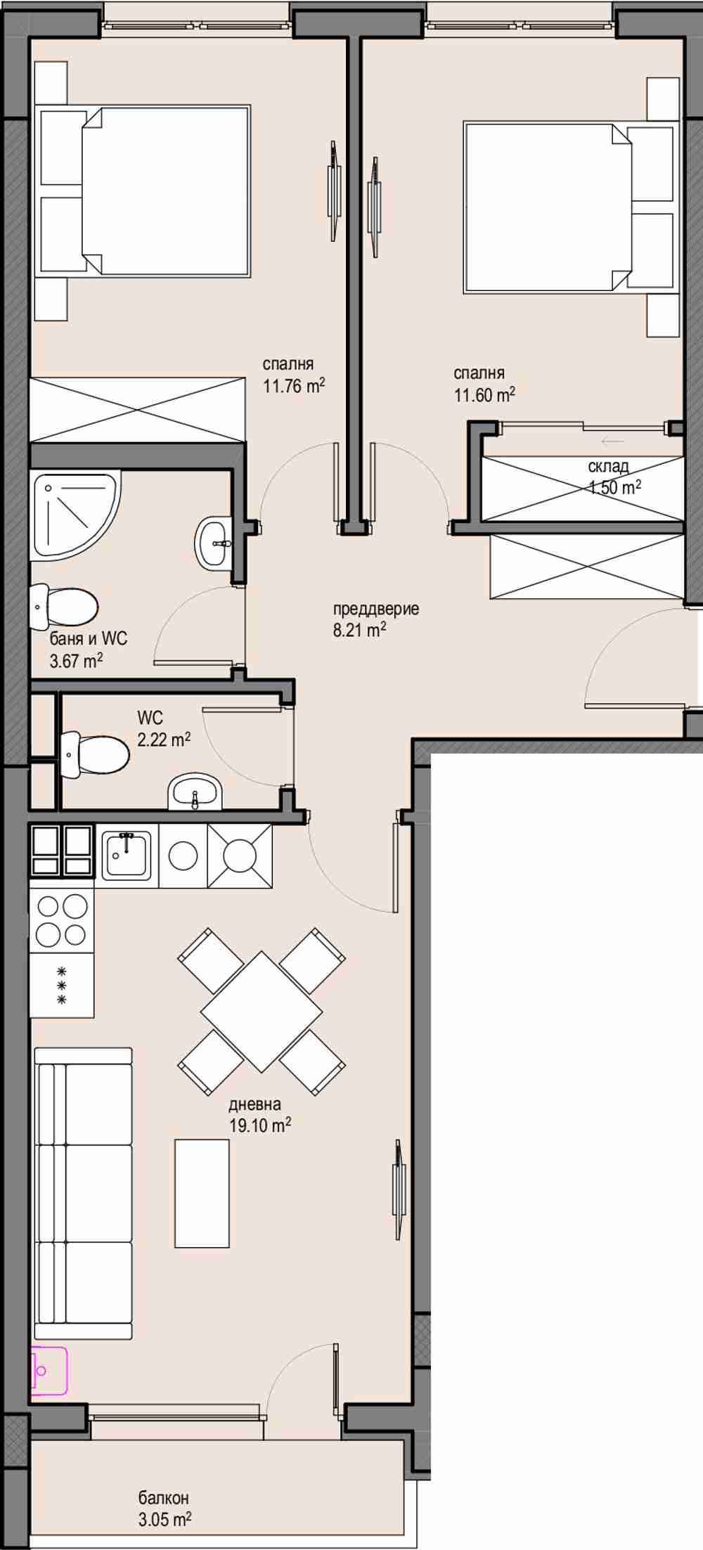 Предлагаме Ви тристаен апартамент в сградата. Съответно на етаж- 4 от 8. Обща площ 83.77 кв.м. нетна площ 73.68 кв.м. Изложение - изток/северозапад . Апартаментите се продават на шпакловка и замазка. Цената е с включено ДДС.