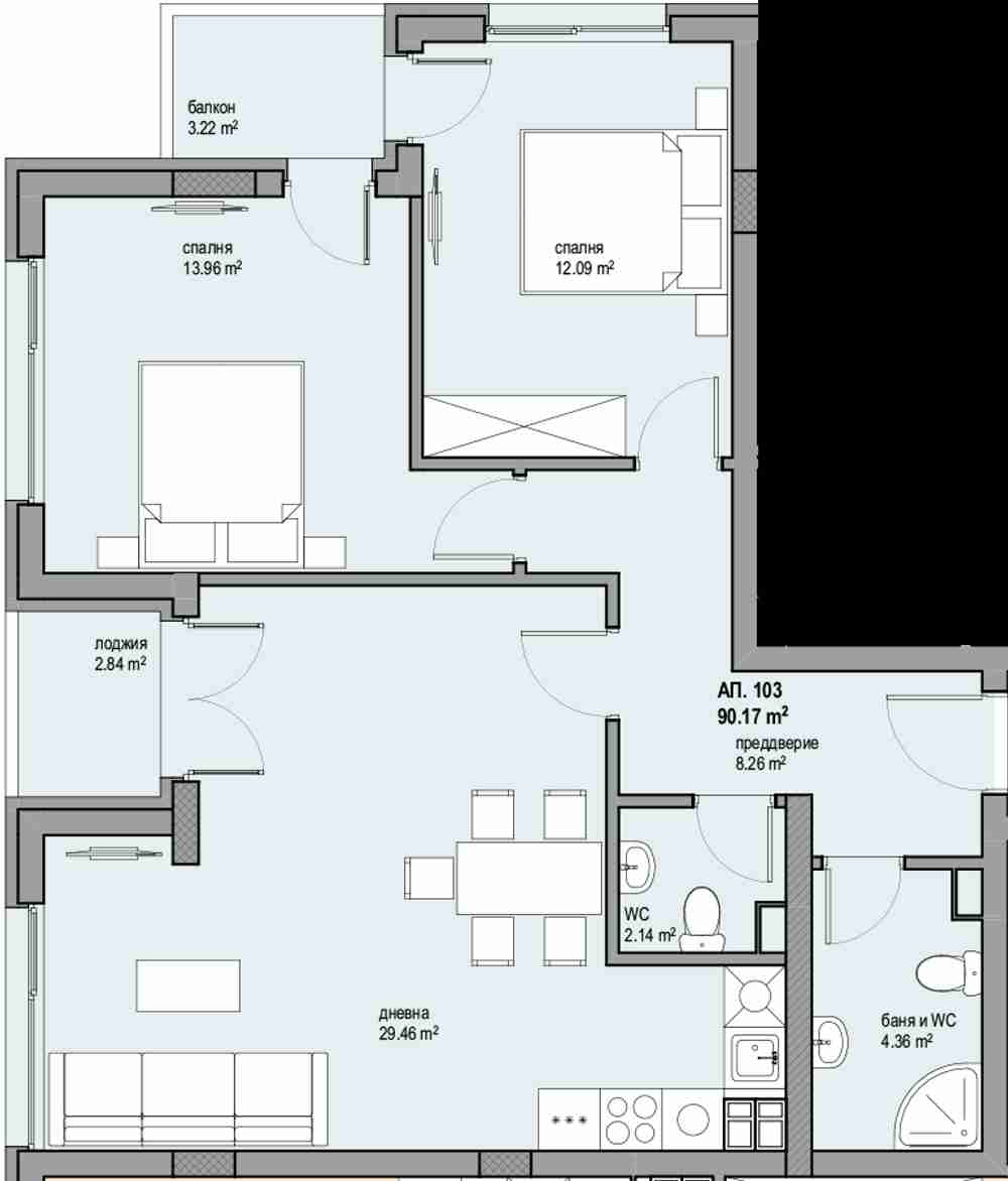 Предлагаме Ви тристаен апартамент в сградата, съответно на етаж - 3 от 6. Обща площ 108,36кв.м. чиста площ 90,17кв.м. Изложение- северозапад. Цената е с включено ДДС. Апартаментите се продават на шпакловка и замазка.