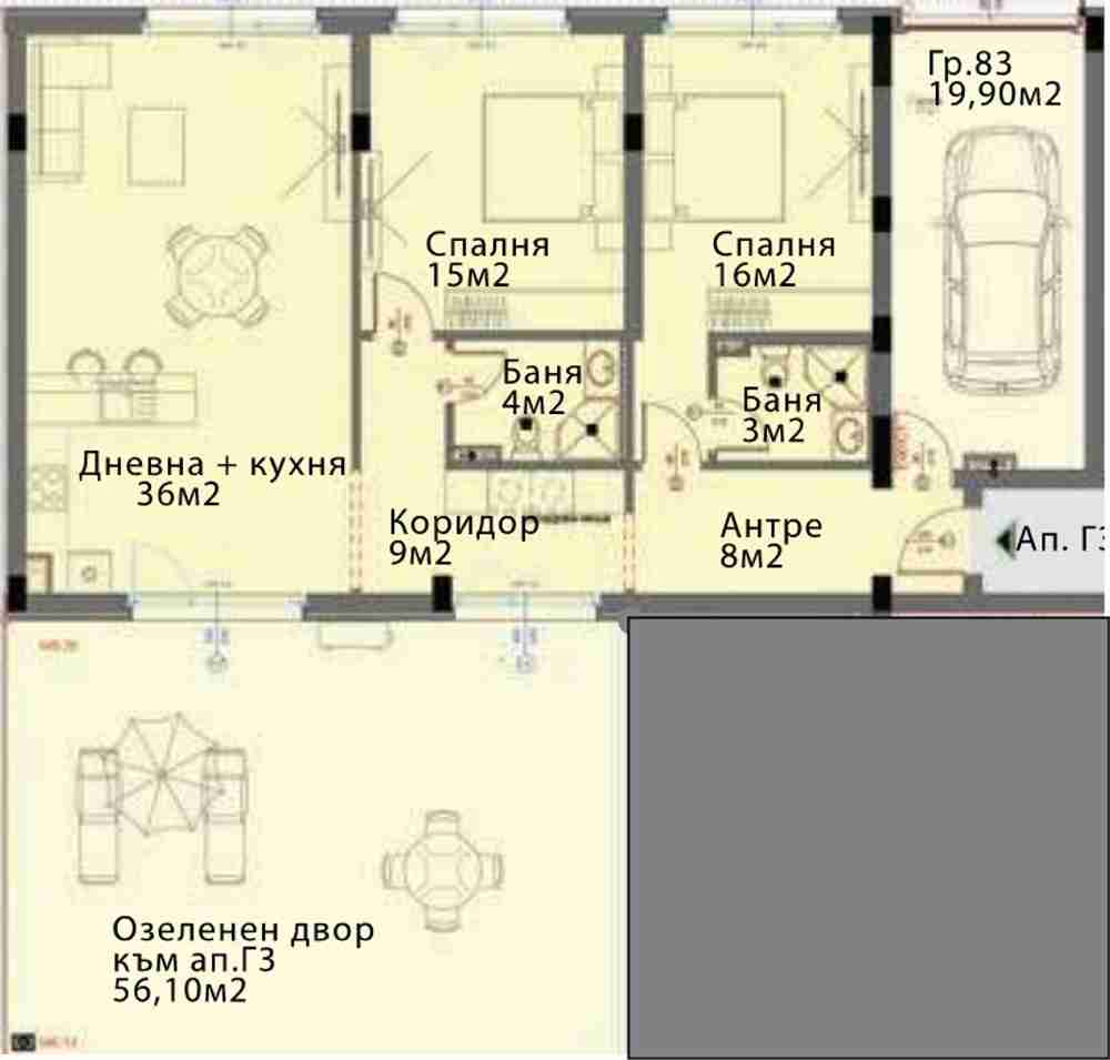 Тристаен апартамент с гараж и двор в жк. Модерно предградие.