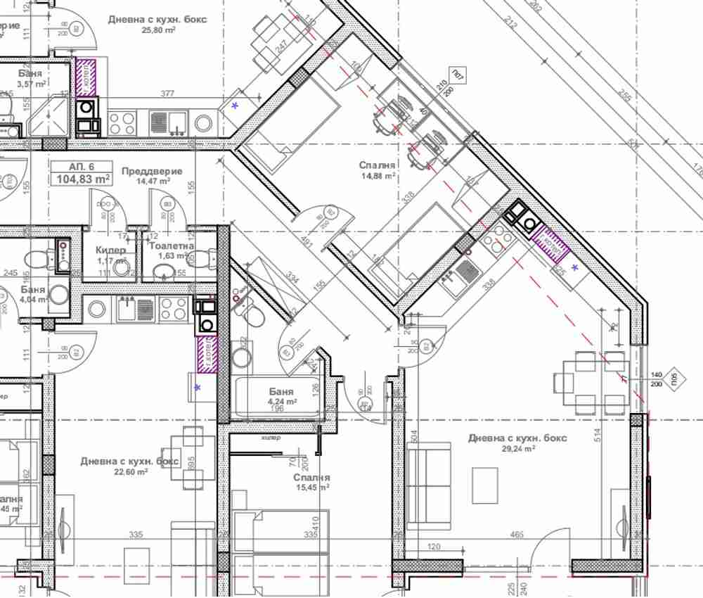 Предлагаме Ви тристаен апартамент в сграда Б. Обща площ 118.03кв.м. чиста площ 104.83кв.м.